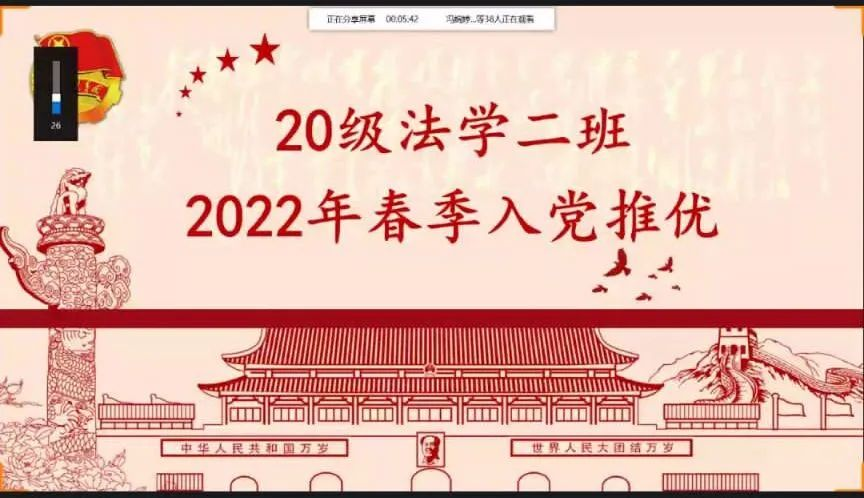 百年征程波澜壮阔,百年初心历久弥坚。2020级法学二班共有团员35名,为了坚定永远跟党走的信念,向党组织靠拢,时至今日,共有20名团员提交入党申请书。承蒙学校、学院关爱以及我支部各位同学的努力,入党推优工作取得重大成效。我支部现有入党积极分子11人。我们始终将建设充满战斗力、凝聚力的班级组织作为支部建设的重要目标。