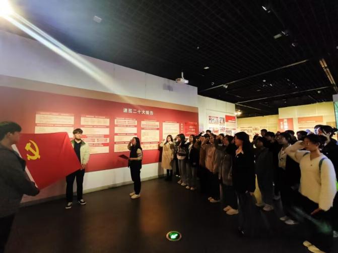 最后,学生党支部书记杨云燕带领全体党员在中国辉煌十年的展映重温入党誓词。整齐划一的入党誓词映入耳帘,回响于博物馆的每一个角落,强烈震撼着在场的每一位党员,一字一句,神圣而豪迈,体现了党员同志们对中国共产党的无限忠诚。