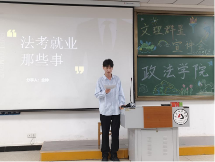 宣讲人金钟分享了自己的法考与考公心得,对于学习方法,金钟学长从自身出发重点分享了法考备考的一些经验。谈到专业学习,金钟学长从抢夺和抢劫的相同点和不同点出发,告诉了我们法考知识的细碎,提醒我们要尽早了解各类专业知识以及考察重点。在此基础上,他分享自己如何制定学习计划、如何高效利用时间、如何克服学习中的困难、如何调整心态等经验,鼓励大家明确每个阶段的任务与目标,勇于面对挑战,全面发展。