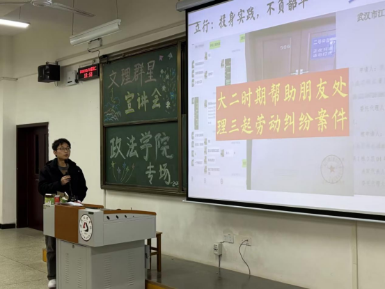 宣讲人乔于航围绕社会实践与法学学习分享了自己的个人经历与宝贵经验。乔于航学姐以“勇敢地迈出人生的第一步”作为分享主题,结合自身在法学领域参与社会实践的亲身经历,给同学们带来了生动的一讲。乔于航学姐分享了自己参与法律援助的实际经历,告诉同学们积极主动的态度在大学生活中至关重要。面对复杂的案件事实,她凭借积极探索的精神,成功解决了诸多难题。同时,她鼓励同学们积极参加各类实践活动,积累经验,锻炼团队合作精神。
