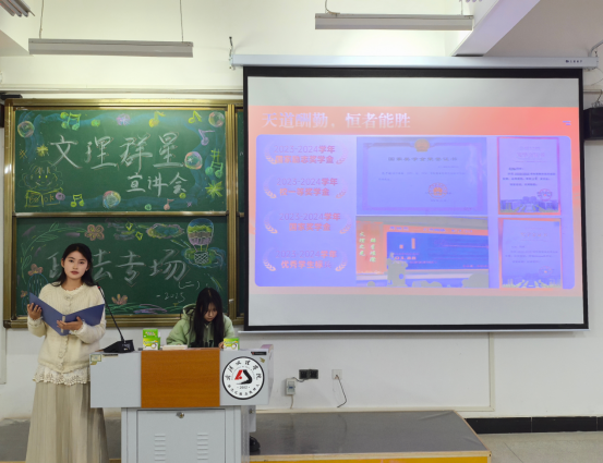 宣讲人曾媛结合自身经历分享了学生干部工作经验。入学伊始,她便积极投身于分团委宣传部的工作,秉持认真负责的态度,发扬团队协作精神,出色地完成了各项任务,也讲述了她成为学生干部三年来经历的困难及解决方法,她说每一次主动的选择、每一份真诚的投入,都会在未来某个时刻回馈你惊喜。最后,曾媛学姐将“山不让尘,川不辞盈”作为结语,不必追求完美,因为真实的成长往往藏在笨拙的坚持里。四年后回望时,愿大家能如她一样能笑着说:“我没有辜负这段最好的时光”。