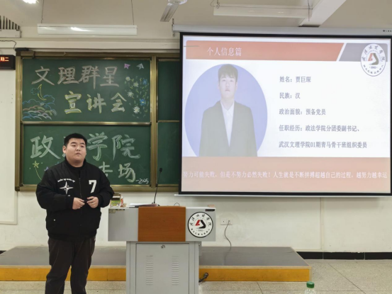宣讲人贾巨琛进行学生干部经验分享,他就自身心得体会进行分享展示。他首先以“何为入党?”“入党的目的为何?”这两个问题为出发点向同学们展示了他自入学以来积极参加校内组织的各项活动、积极参加团学各项工作的出彩经历,鼓励同学们多多参与到校园文化活动中去,“锐意进取,勤学苦练”是他对自身学习经验的总结的八字真言,他提醒同学们平时需要多注重学习成绩,在学习上一定要有进取心,不断攀向更高处。