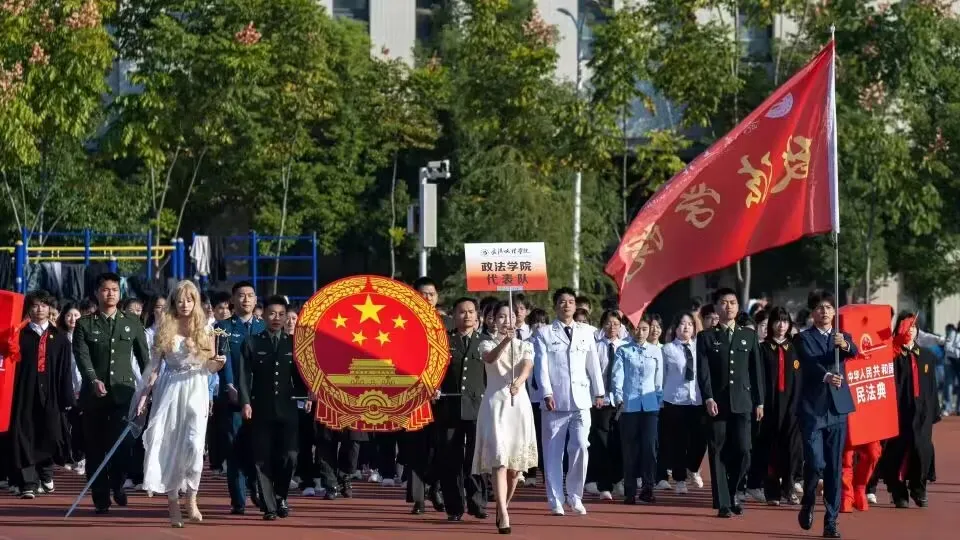 伴随着《运动员进行曲》铿锵有力的旋律,国旗队、校旗队、校徽队、校训队、鲜花队,以及各学院方阵依次入场,他们步伐稳健、列队整齐。且看304永利集团方阵队伍步伐坚定有力,队员们精神抖擞,高举国徽,喊着响亮的口号:“挥法律之利剑,持正义之天平,除人间之邪恶,守政法之圣洁”展现了政法学子对正义的追求,也展现了新时代大学生的向上风貌。
