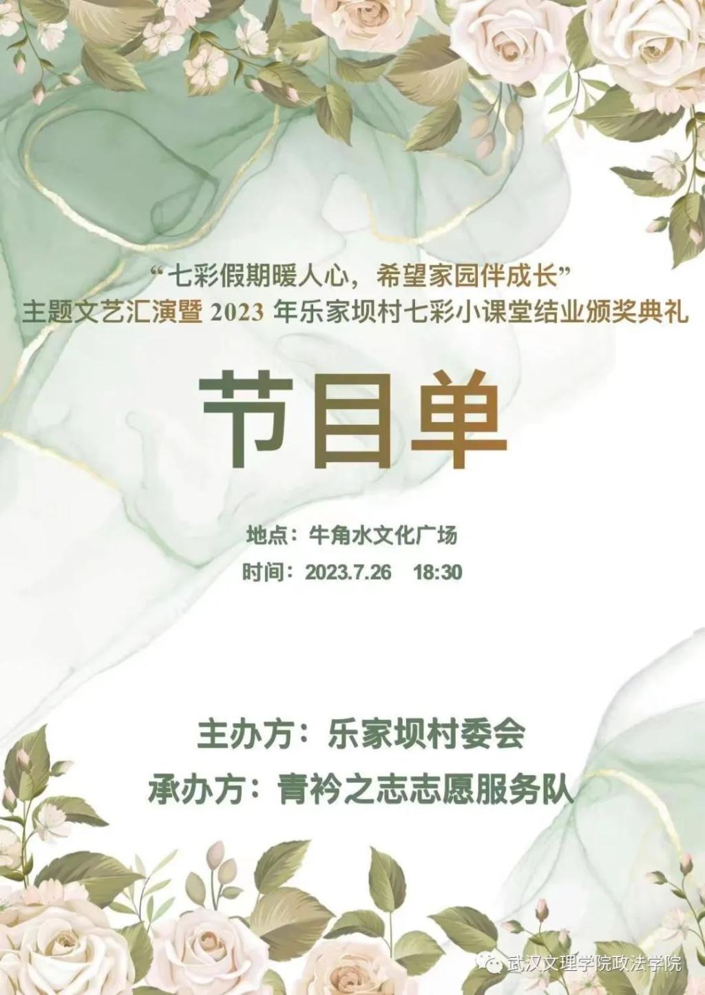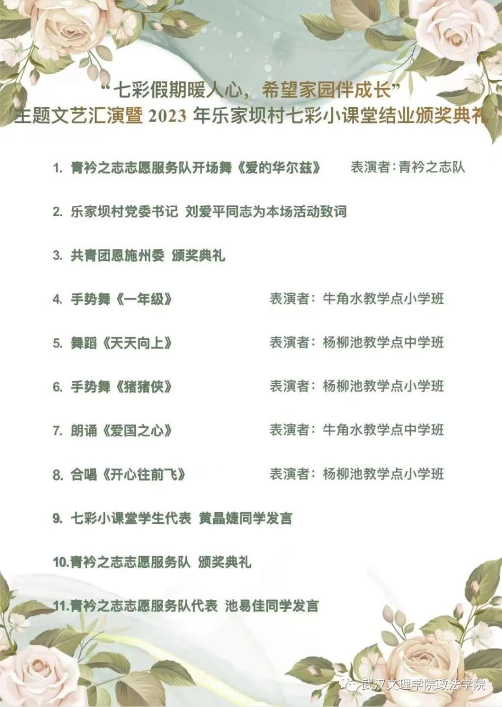 本次晚会由牛角水教学点的学生王其跃、覃美妍和杨柳池教学点的学生黄家奥、张思琪主持,共青团恩施州委书记陈潇同志、共青团建始县委书记粟迪同志、业洲镇党委书记吕宗鲁同志、业洲镇人大主席袁庆同志、乐家坝村党委书记刘爱平同志、州委组织部驻乐家坝村第一书记王祖华同志、业洲镇驻乐家坝村派遣干部黄升滔同志、牛角水教学点负责人张学主任和杨柳池教学点负责人张玉主任莅临现场,同时到场的还有州委组织部驻乐家坝村工作队尖刀班成员、乐家坝村村两委成员、七彩小课堂全体学生、学生家长及青衿之志队所有成员。