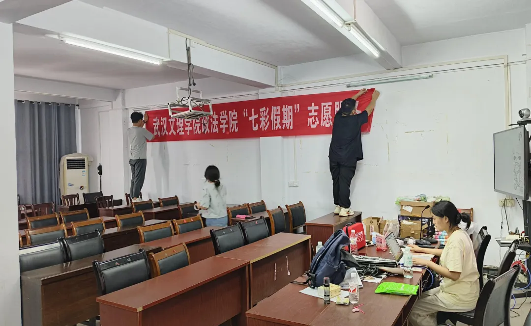 7月15日下午,志愿者们开始为第二天各教学点的开班仪式做准备,他们拿起扫把和抹布打扫教学场地的卫生,整理好桌椅板凳,张贴宣传横幅,并在各负责人的带领下对第二天的开班流程进行了彩排。