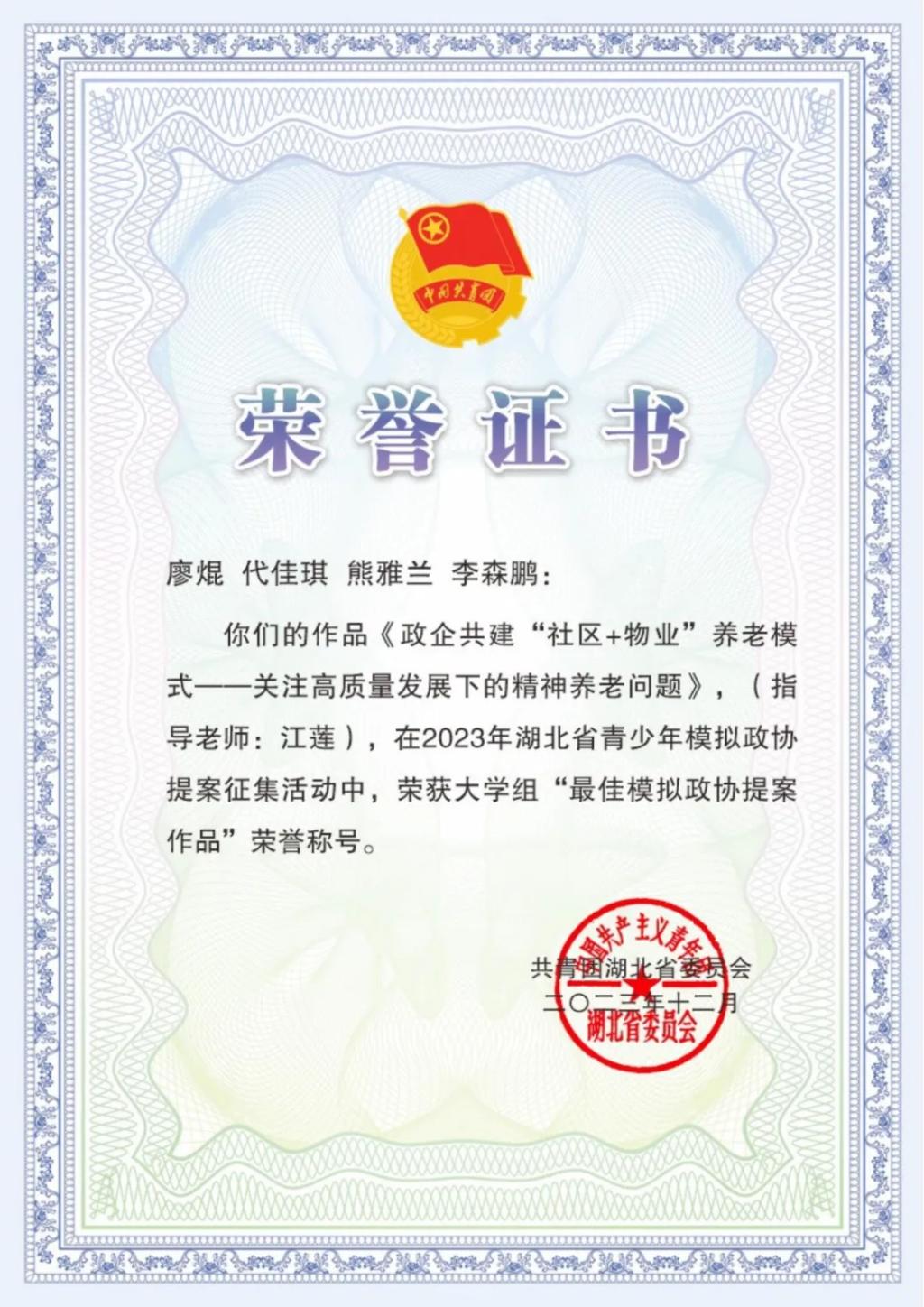 为深入学习宣传贯彻党的二十大精神,引导广大青少年有序参与社会主义民主政治实践,准确理解全过程人民民主内涵实质,领悟新时代伟大变革背后的“制度密码”。304永利集团学子积极参与2023年湖北省青少年模拟政协提案征集活动。其中一组作品荣获大学组“最佳模拟政协提案作品”荣誉称号。让我们一起看看吧!