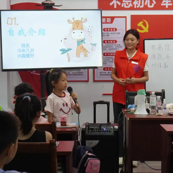 初次相识,小朋友们在志愿者小老师的带领下一一上台自我介绍,从姓名年龄,到唱歌跳舞的才艺展示,小朋友们踊跃展示着自己独特的风采,希望在新朋友和新老师面前留下深刻的一面。青春的生活永远充满惊喜与狂欢,为打破沉默,让温暖与欢乐在教室传递,一场欢快的破冰之旅顺利展开,随后志愿者小老师们带领同学们进行了“看字读色”、“数字传真”等破冰小游戏,让来到陌生环境的小朋友们互相熟悉、相互了解,为接下来的学习营造和谐有爱的环境。在大家的自我介绍和破冰小游戏中,小朋友们从最初的害羞腼腆到一起嬉笑玩闹,这一刻大家其乐融融,尽现暑期学堂风采。