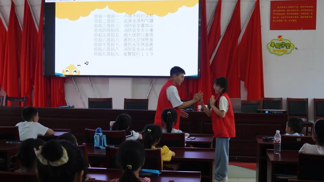 “你拍一,我拍一,小孩不玩打火机;你拍二,我拍二,远离电源和气罐……”郎朗上口的口诀让小朋友们一下子记住了如何在生活中注意消防安全。本罗溪坝社区的安全课程由韦代杏担任主讲 ,以预防潜在的火源危险和遇到火灾时如何自救为侧重点展开。首先通过播放一段熊大、熊二“出演”的卡通短片,告诉小朋友们遇到火灾不要惊慌,湿毛巾、捂口鼻、弯腰走、避电梯。随后韦代杏给小朋友们讲了119火警电话的由来和记忆方法,提醒小朋友们要牢记。最后带领小朋友们一起学习“消防拍手歌”,组织小朋友和自己的同桌边朗读边拍手,把消防安全牢牢记在心中。消防安全靠大家,快乐你我他。