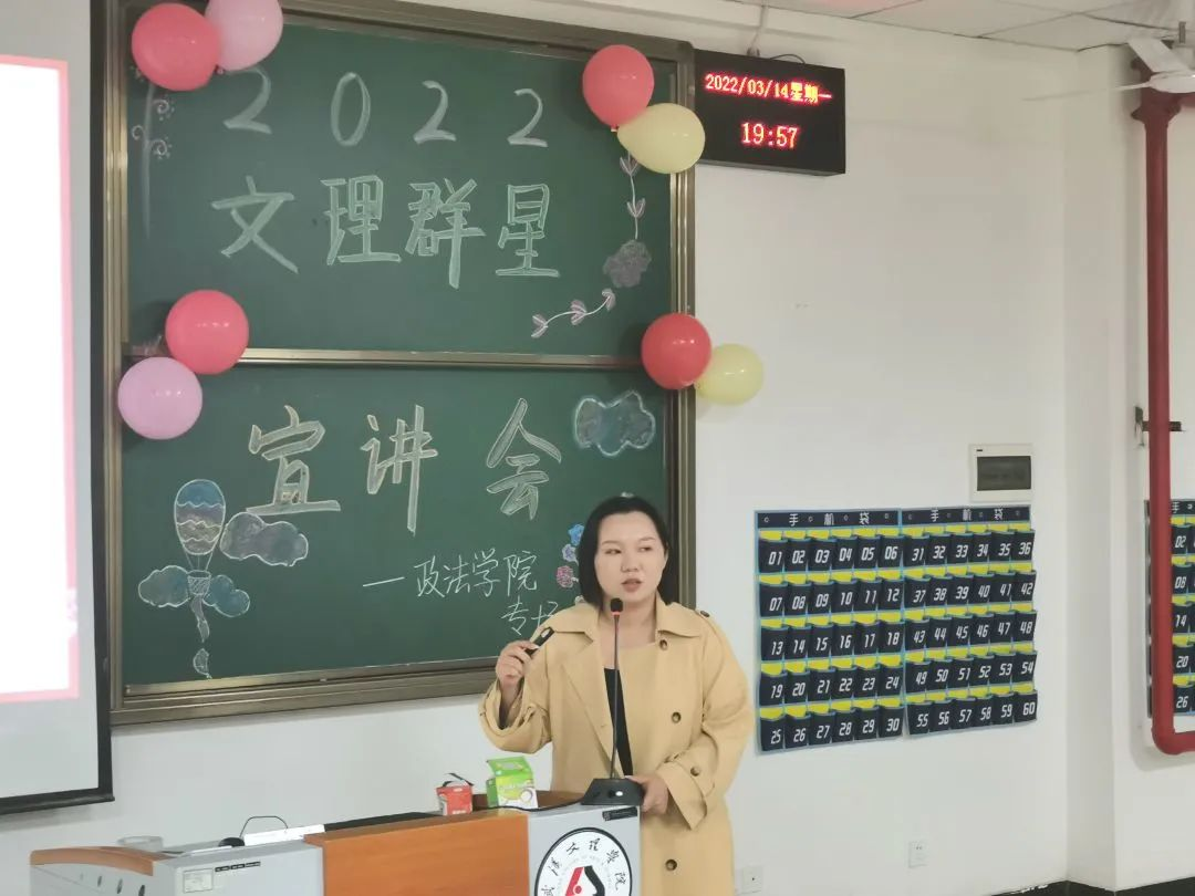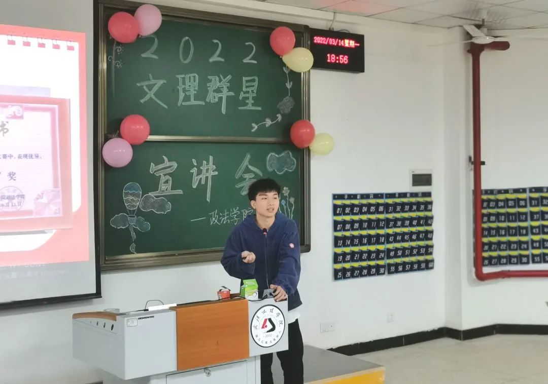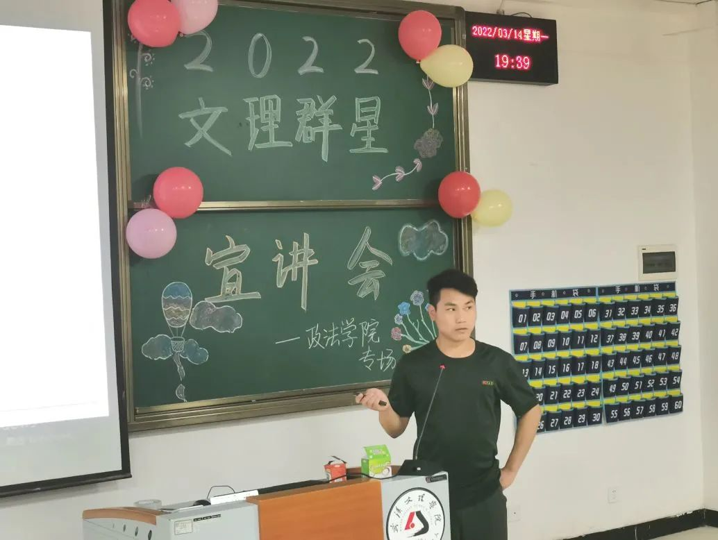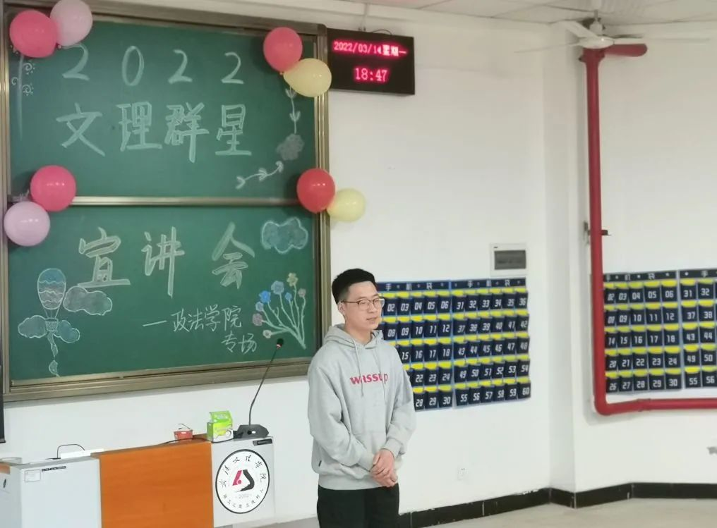 “学而不思则罔,思而不学则殆”,思考和交流是学习的基础。为了帮助大一学子更好地适应大学生活,提升自身素养,解决实际困难,3月14日,304永利集团于4-121召开了“文理群星”宣讲会。