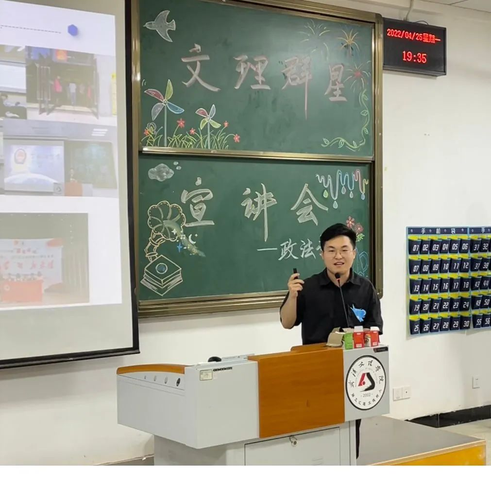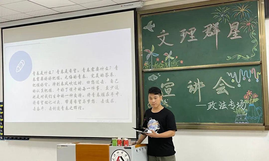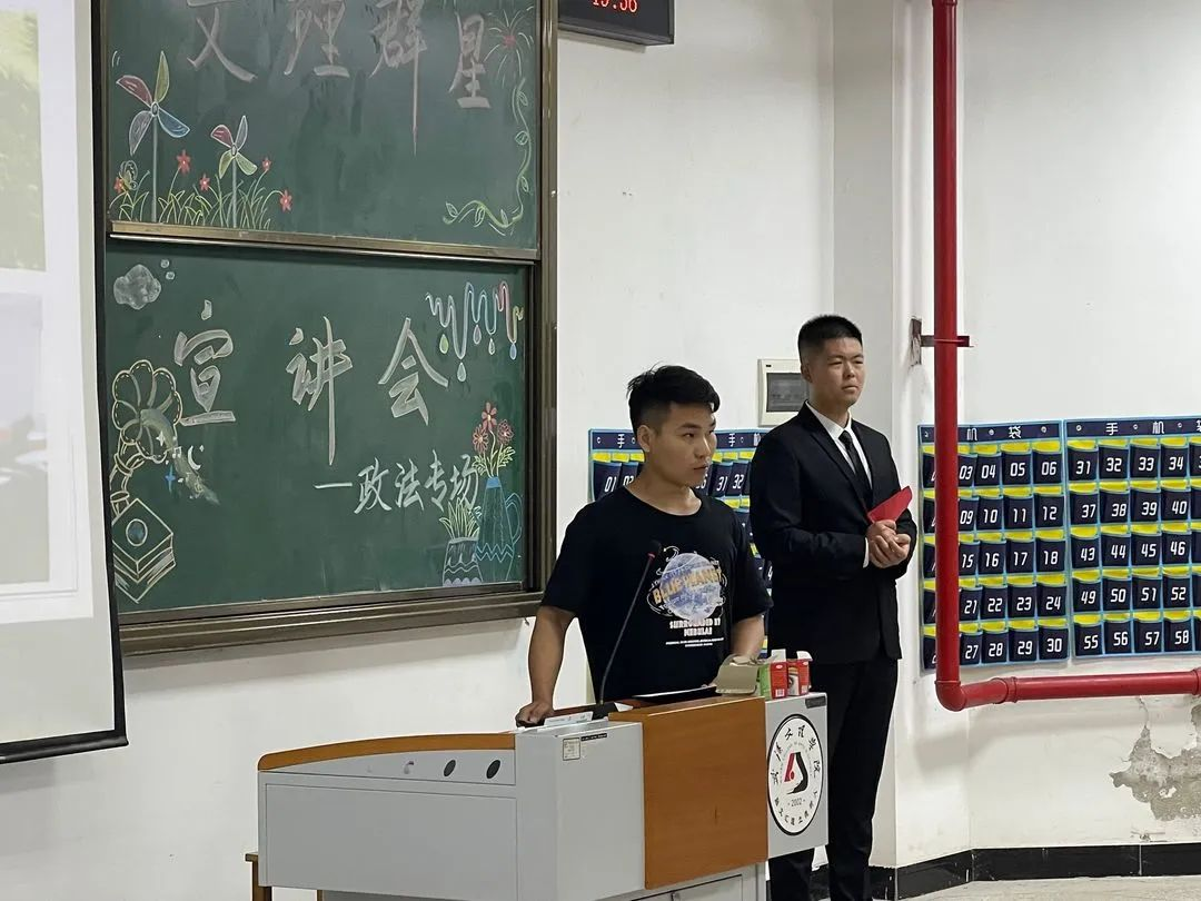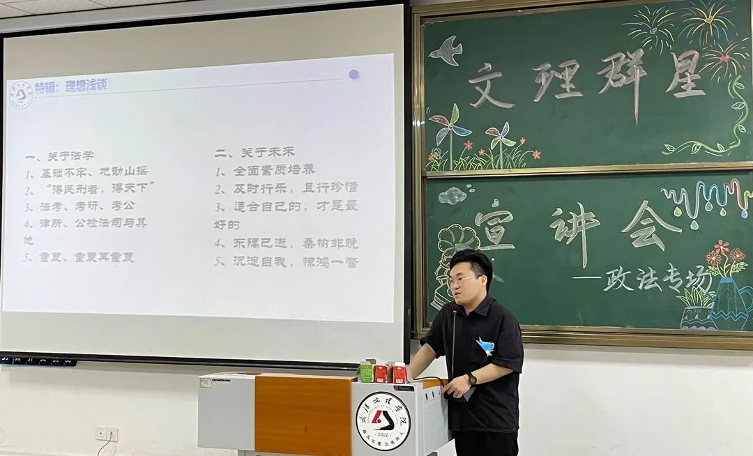 宣讲内容:袁宇学长告诉我们“将学习变成一种兴趣”,兴趣能一直陪伴我们,那学习就能如影随形,同时,团学也是大学生活中重要的一部分,能展示自己提升自己。我们要做好未来规划,选择适合自己的考公考研道路,并推荐出适合法学的精彩书籍。“扎根”是学长留给我们的思考。