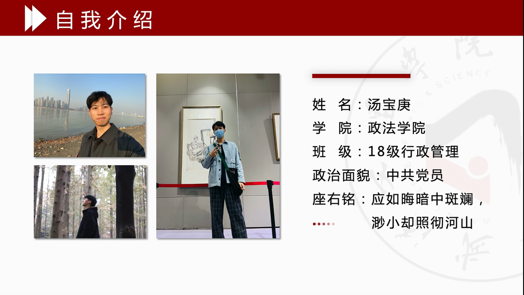 宣讲内容:汤宝庚学长用亲身经历鼓励我们努力学习,多参加校内各项比赛,坚持“不到楼兰终不还”的拼搏精神。在课外积极投身于社会实践,发扬自己的兴趣爱好、参加文学创作、分享考研经验,不负韶华是对我们共同的勉励。