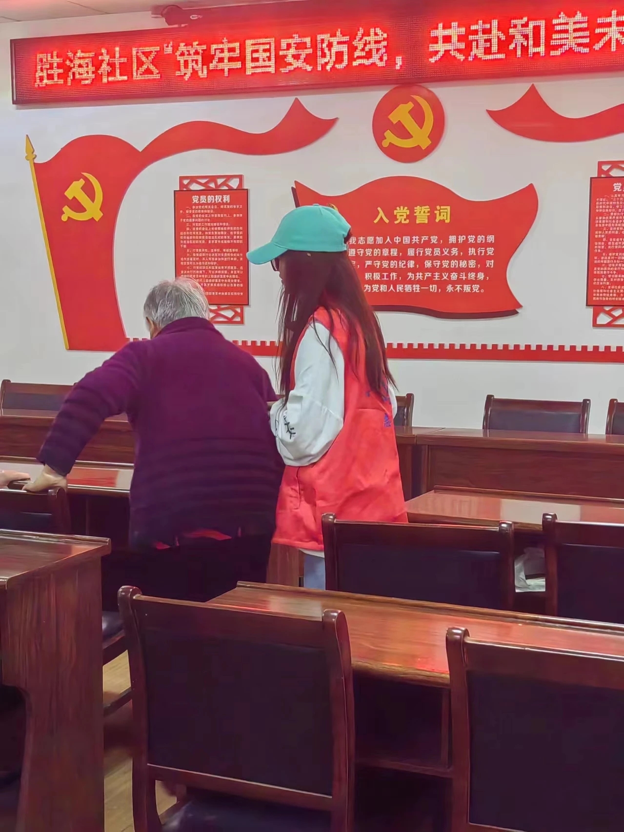 活动伊始,社区居民有序入座。志愿者们细心搀扶腿脚不便的老年人,和老人们闲话家常,拉近了与社区居民的距离。