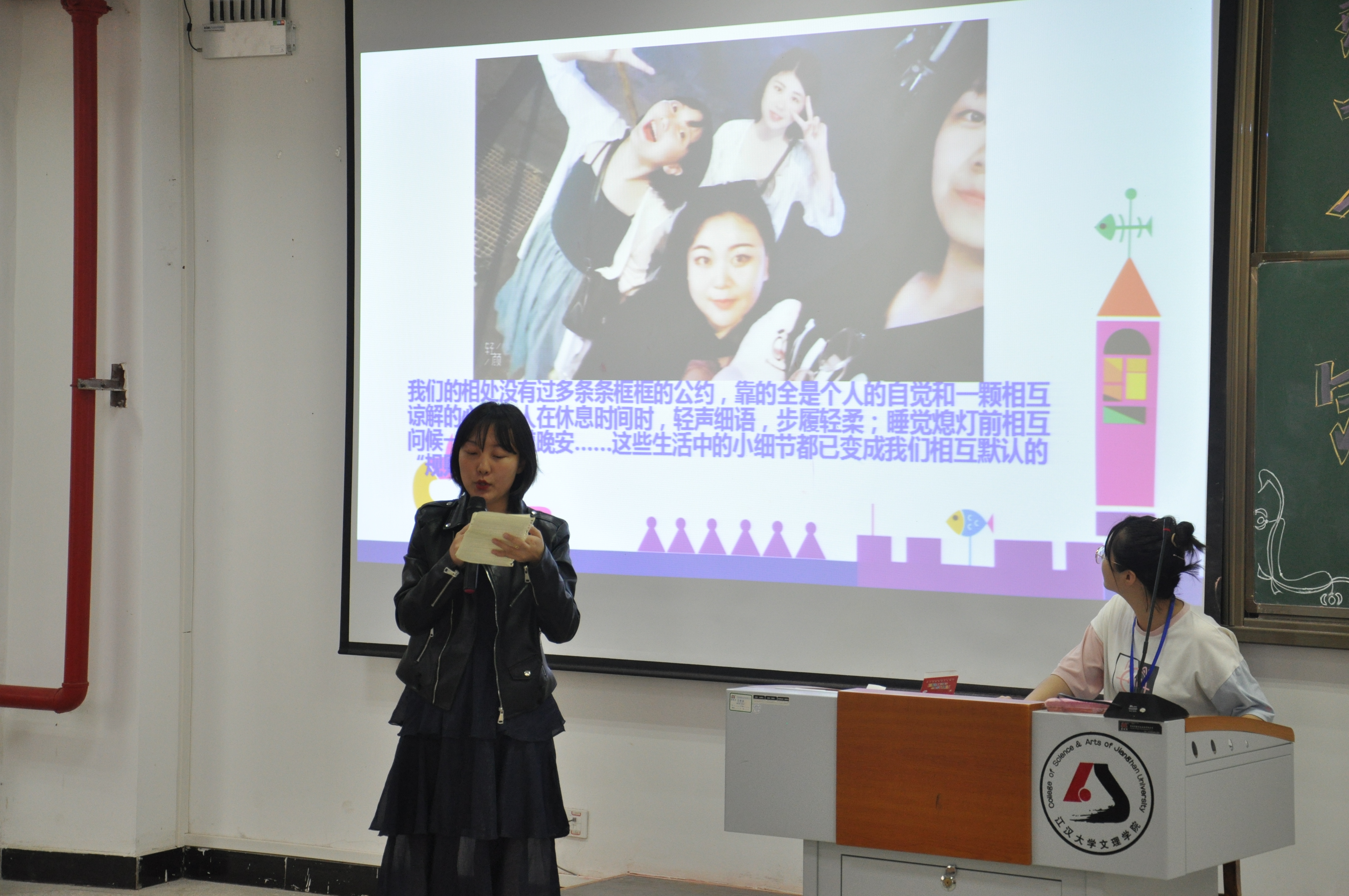 首先上场演讲的是竞选特色寝室的14-2301,她们分别以“三人定律”“沙雕日常”为寝室特色,将自己寝室中最真实,最与众不同的一面展现在嘉宾及观众面前。与14-2301争夺特色寝室称号的是14-2120寝室,她们寝室的四人来自不同的省份,然而地域对于她们的交往没有任何的影响,她们是以“塑料姐妹花”为寝室特色,室友之间的打打闹闹是友情的调味料,尽管以“塑料姐妹花”著称,但四人之间密不可分。双方演讲完毕后,主持人宣布橙色代表14-2301,蓝色代表14-2120,由现场嘉宾及观众开始投票。