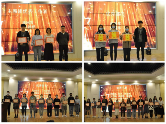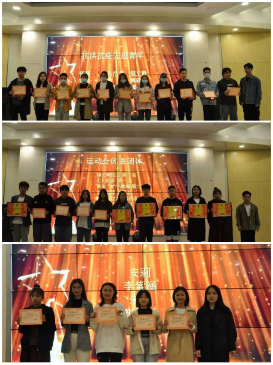 接下来,颁奖仪式正式开始。依次对运动会优秀工作者、运动会优秀团体、抗洪抗疫先进青年、优秀干事、优秀部长、优秀部门、优秀学生干部(校级)、主席团优秀工作者进行颁奖,并合影留念。