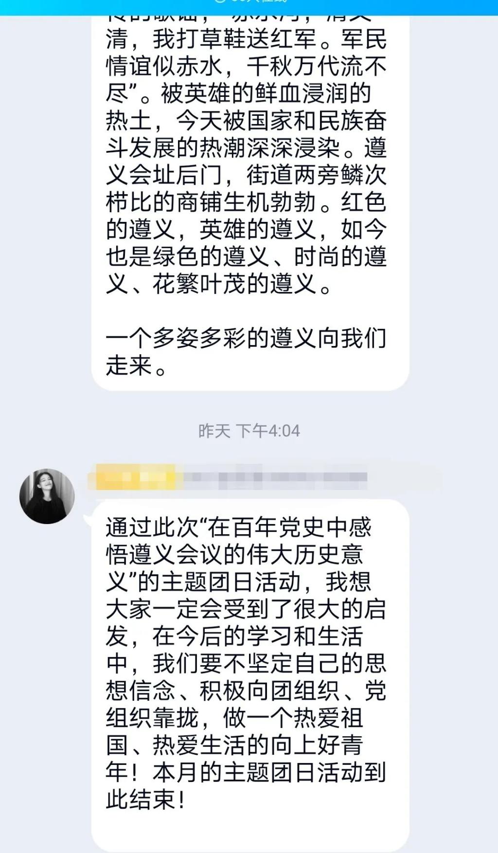 开展此次团日活动让同学们更进一步领略遵义会议精神,提高自身的党性以及团支部的凝聚力量,坚定跟党走,为国家以及党的建设增添自己的一份力。通过党史学习教育,在于进一步提升自己的思想境界,转变自己的工作作风,增强自己的工作能力。明白当前我们的任务是拥党、立志、向党。