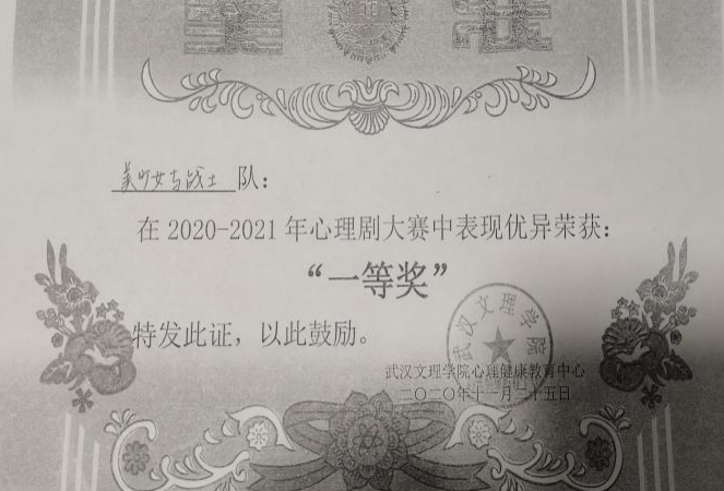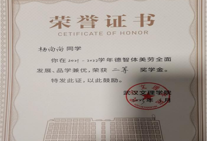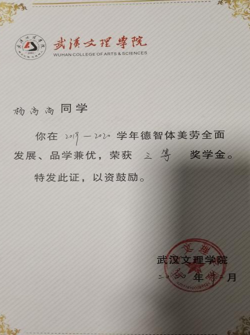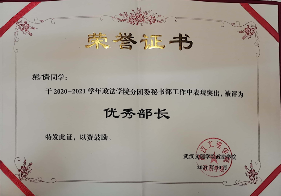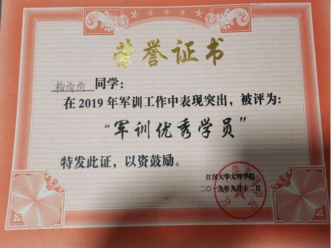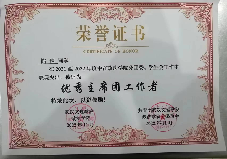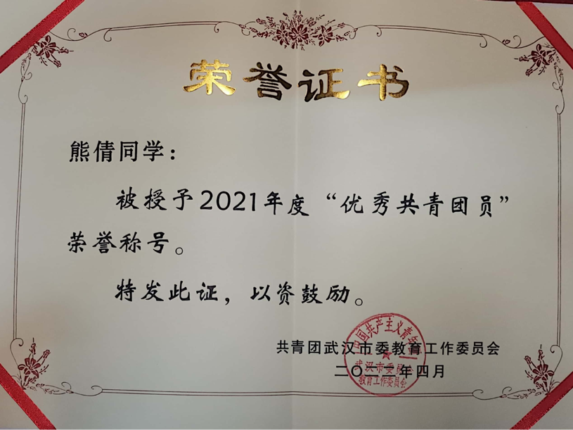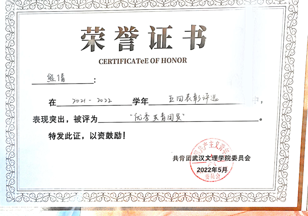 先后荣获“军训优秀学员”、“2019—2020年校级三等奖学金”、“第四届校内辩论赛冠军”、“湖北省第十三届挑战杯•中国银行大学生课外学术科技作品竞赛省赛三等奖”、“2020—2021年心理剧大赛一等奖以及最受观众喜爱奖”、“第一期文理法学读书会优秀组织者”、“2020-2021年奋进奖学金”、“学宪法,讲宪法知识竞赛一等奖”、“第二届模拟法庭大赛优秀组织奖”、“2021-2022年校级二等奖学金”等荣誉。