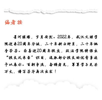 文理建校20周年,祝愿母校“继往二十载,开来一百年”。对学弟学妹们分享交流一下自己的经历和感触,法学专业的学生如选择要从事法律专业,那么建议一定要通过“法律职业资格考试”,通过后趁着年轻,背着包来深圳,深圳是一个极具包容的城市,这里充满机遇,不会辜负积极向上的你。