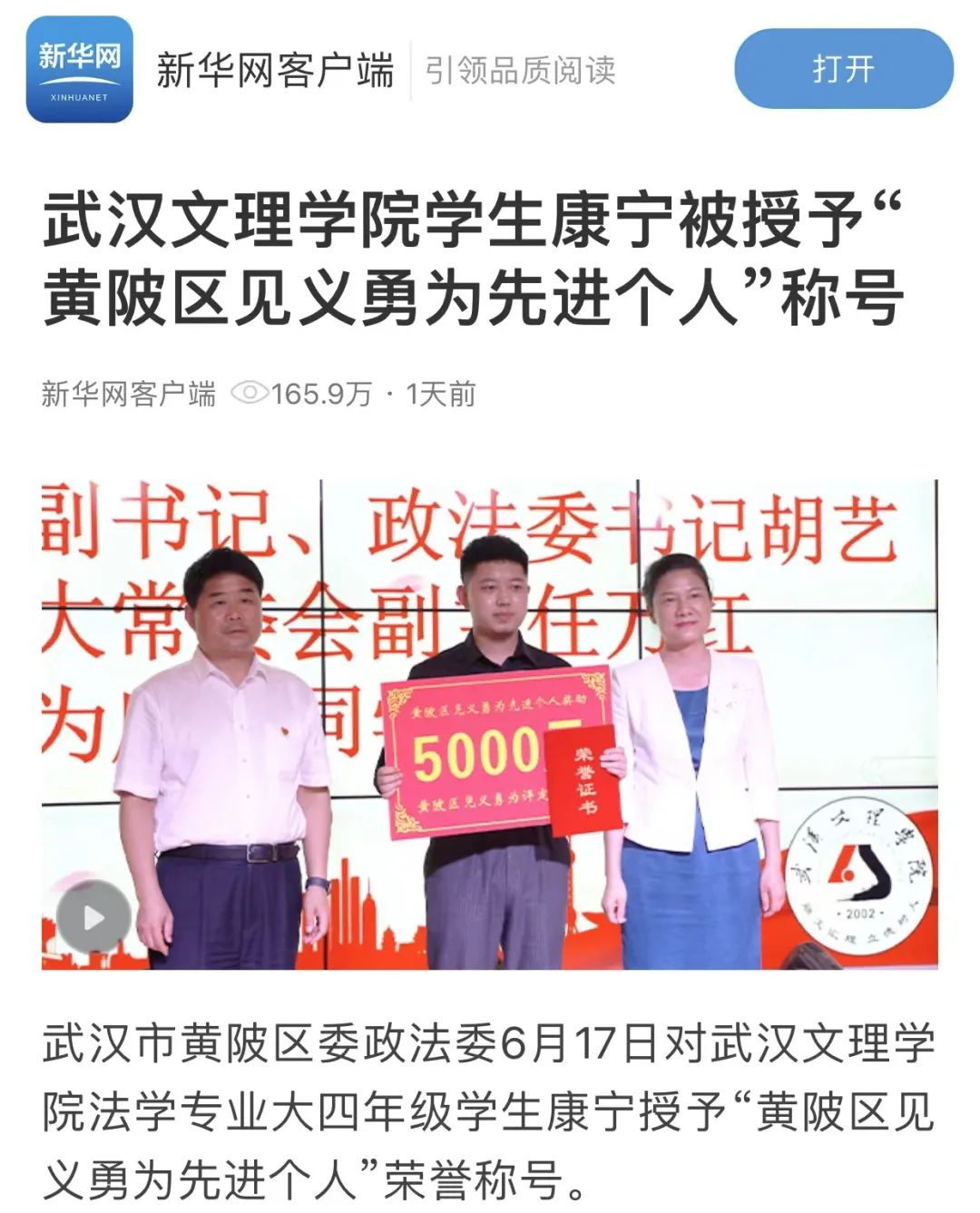 对于这次特殊的经历,康宁同学有话分享:“生命在大自然面前是脆弱、渺小的,我们一定要珍惜并且敬畏生命,活得有意义、有价值。”见义勇为,更需要见义智为,对于整个社会风气来说,见义勇为扬正气,古道热肠暖人心,是一笔宝贵的财富。