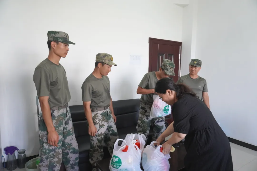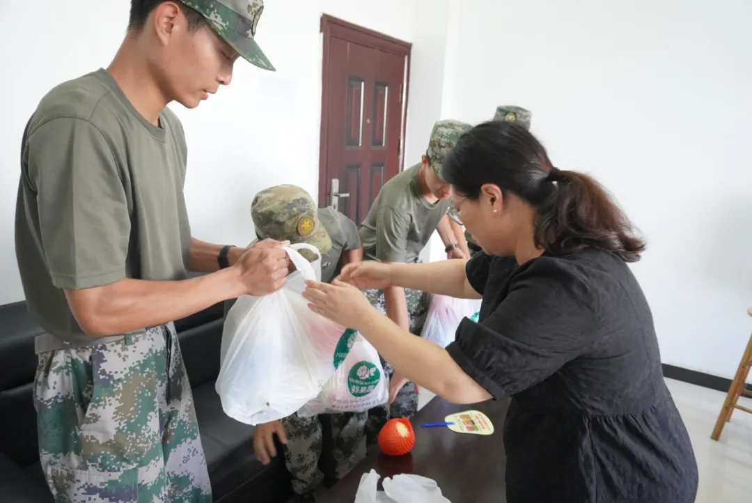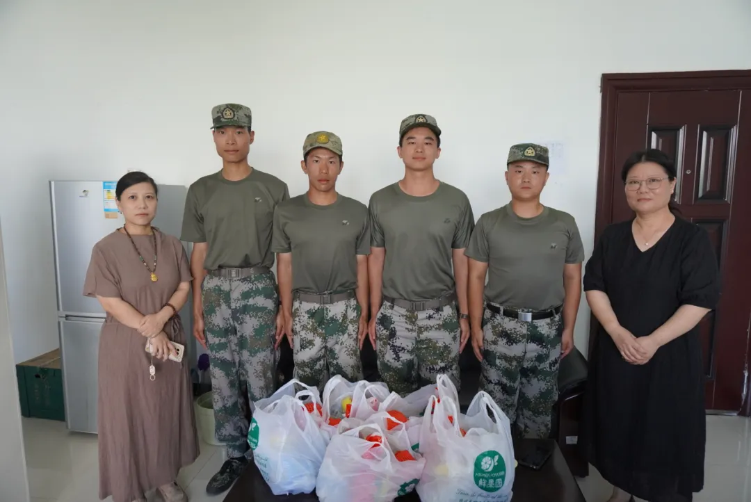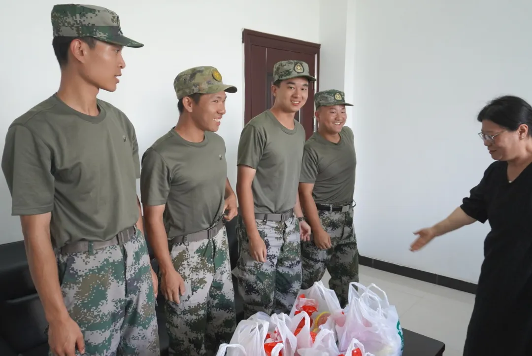 陈海峰院长对各位教官的军训工作日常以及进度进行了详细了解,表示了关心,她表示:军训可以锻炼学生的身体和意志,也可以培养学生的纪律性,对学生之后的学习生活有很大帮助。而教官在军训中起到的引导作用非常重要,训练工作很有意义。她特别叮嘱教官们,天气炎热,要注意身体健康,做好防暑降温准备。最后,陈海峰院长对教官们的工作表示了充分肯定,并对各位教官提出表扬,亲自为每位教官送上了精心准备的慰问礼,与他们合影留念。