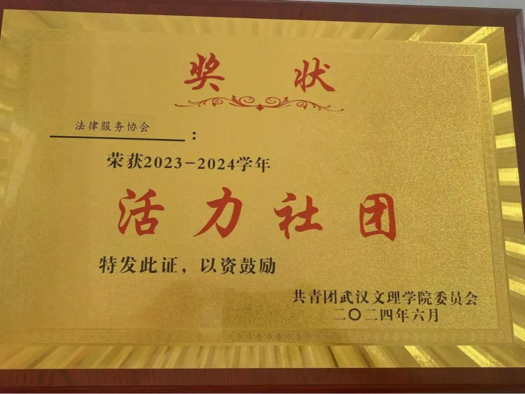 为健全规范我校学生社团管理机制,完善社团内部机制,表彰优秀社团,促进社团精神文明建设,推动社团健康、有序地发展,304永利集团于2024年6月7日举办活力社团评选活动。304永利集团法律服务协会积极参评,荣获2023-2024学年活力社团称号。