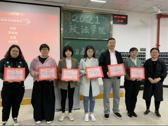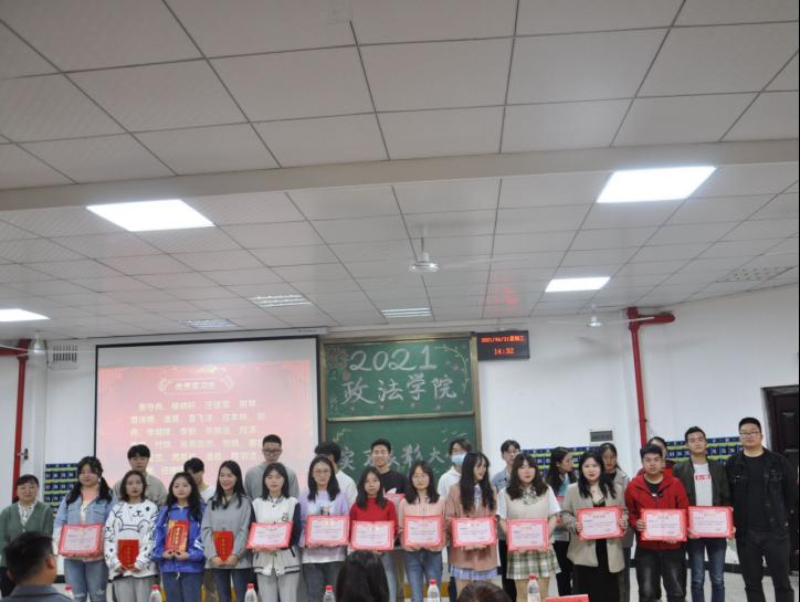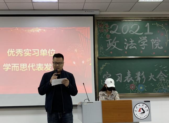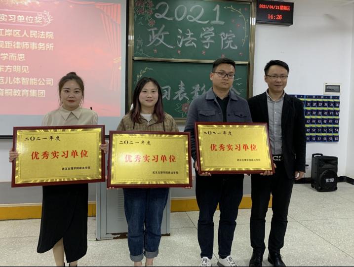 接下来,大会进行了表彰颁奖,优秀实习单位为武汉市江岸区人民法院、湖北超视距律师事务所、学而思网校、东方明见、武汉萌范儿体智能公司、光谷育桐教育集团;优秀实习指导老师为贺霞老师、罗晓霞老师、孟晟老师、孙志萍老师、刘佳老师、张芳老师;优秀实习生为张守冉、侯晓轩、汪佳奕、谢琴、覃诗雨、潘昊、夏飞洋、庄本林、刘丹、李城锋、李盼、张鹏远、段涛、李男、付饶、肖昌浩然、贺婧、秦梦圆、陆兰、周晨航、潘晨、程羽洁、王晓樾、任婕妤。