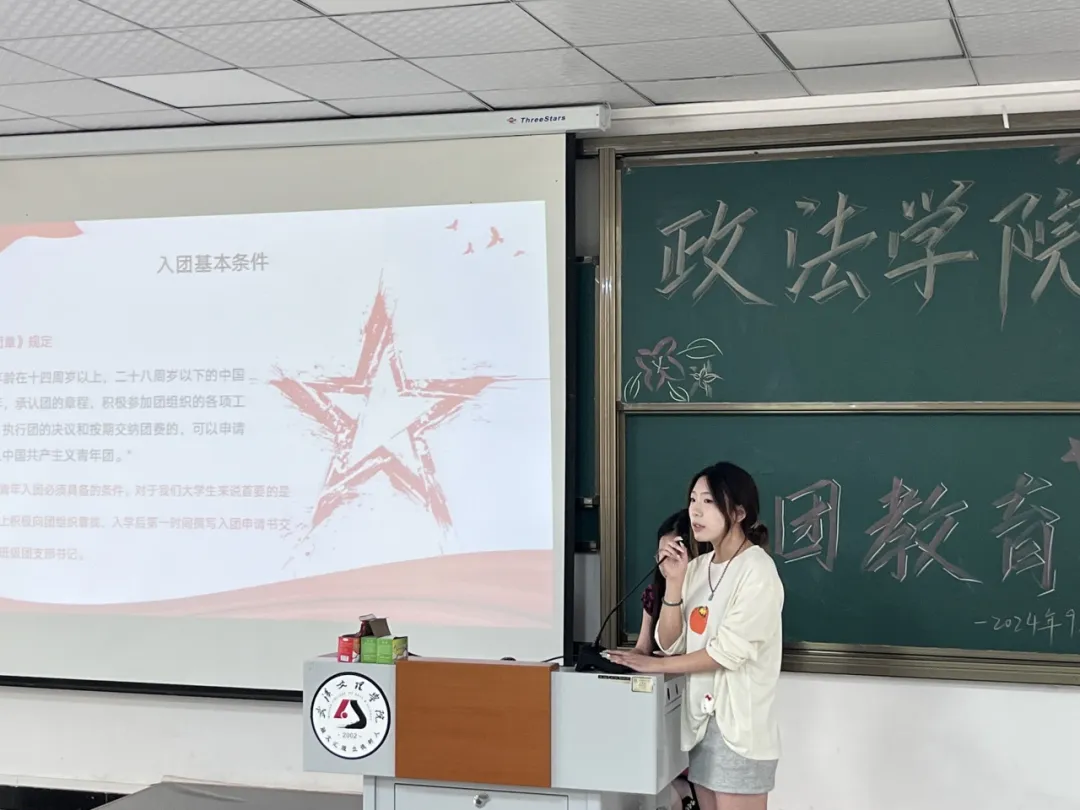 24级法学4、5、6班和行政管理专升本班,由304永利集团分团委副书记曾媛主讲。曾媛学姐首先以入团动机为切入点,在与同学们的积极互动中切入到今天的正题。曾媛学姐介绍了共青团的性质、宗旨、基本任务、组织形式、工作内容、团的组织原则,团旗、团徽、团歌及其内涵,团员必须履行的义务以及享有的权利以及入团的基本条件和流程。并以生动地形式介绍了304永利集团分团委、学生会,邀请24级的新生们多多了解团学,然后加入到团学,奔赴向更充实、更快乐的大学生活。希望新生们争做新时代好青年,严格要求自己,积极向团组织靠拢。