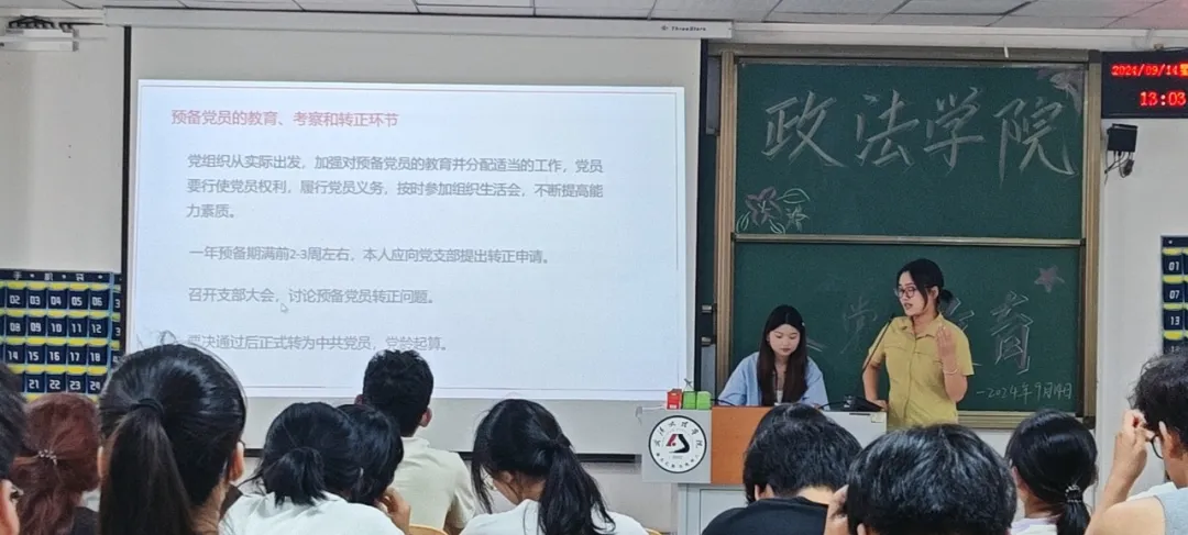 24级法学4、5、6班和行政管理专升本班,由党务小组组长刘韵主讲。她首先指出:加入中国共产党,是我们许多人心中的理想和追求。她鼓励同学们真诚、认真地填写入党申请书并积极递交,努力学习党的理论知识,了解党的历史、党的路线和方针政策,提升政治素养,加深对党的认识。入党流程虽然有些复杂,但每一步都充满了意义和价值。
