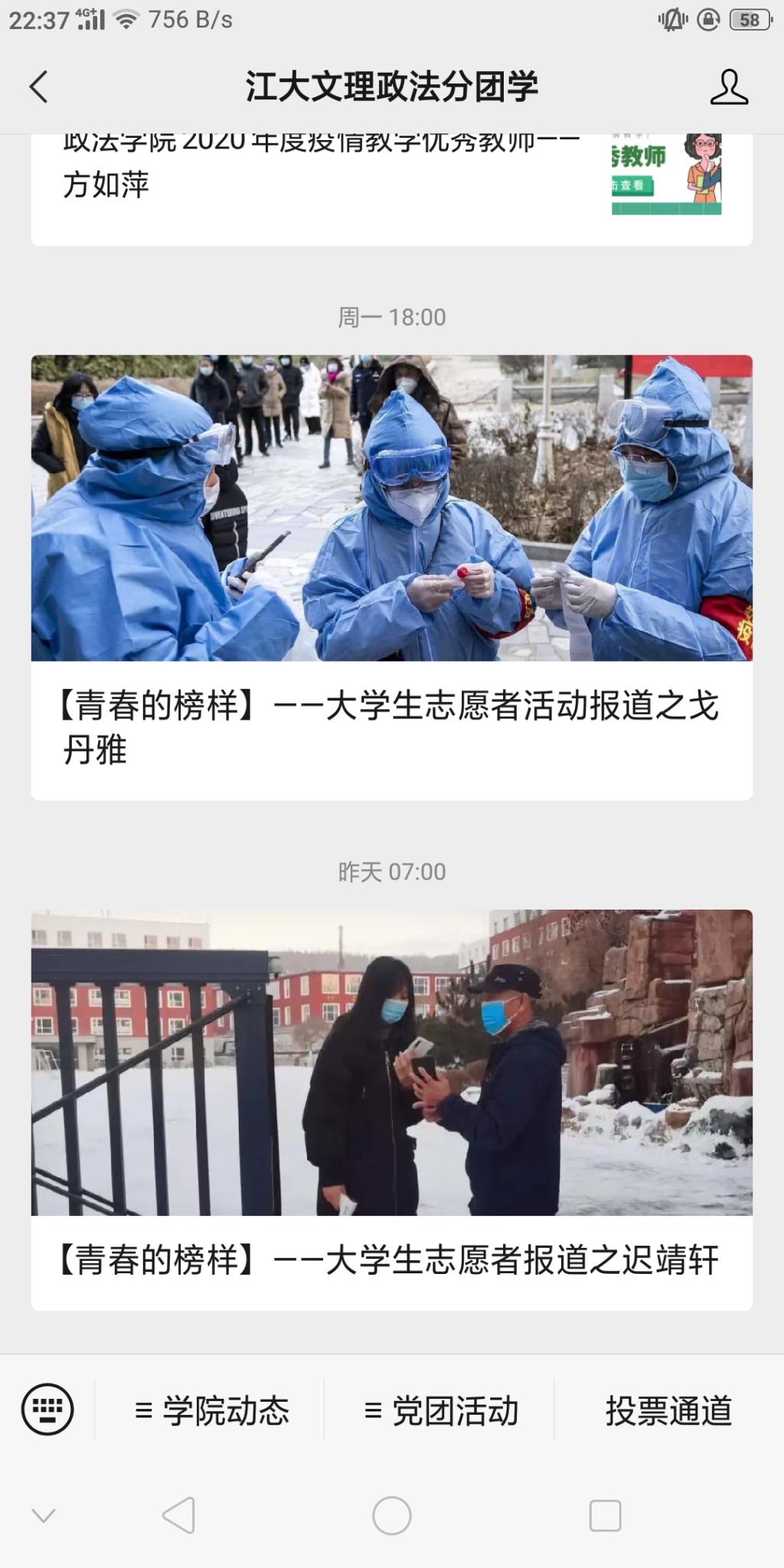 在第三单元,通过学院组织的一系列主题班会活动,同学们深受感染,不仅有积极投身于家乡的抗疫志愿者活动,也有参加社会公益实践活动。即使在严寒的冬季,他们仍然坚持在抗疫志愿者一线,给同学们上一堂“耐人寻味”的“必修课”。