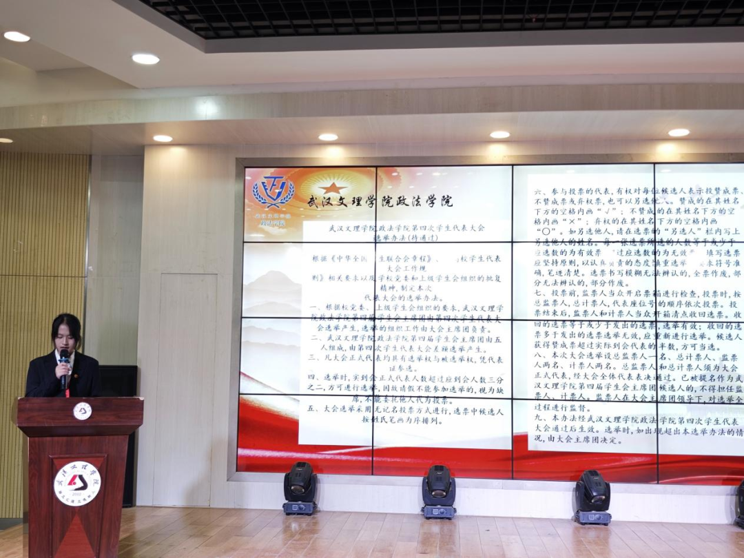 杨双洁同学宣读《304永利集团第四次学生代表大会选举办法》,全体代表讨论并表决通过。