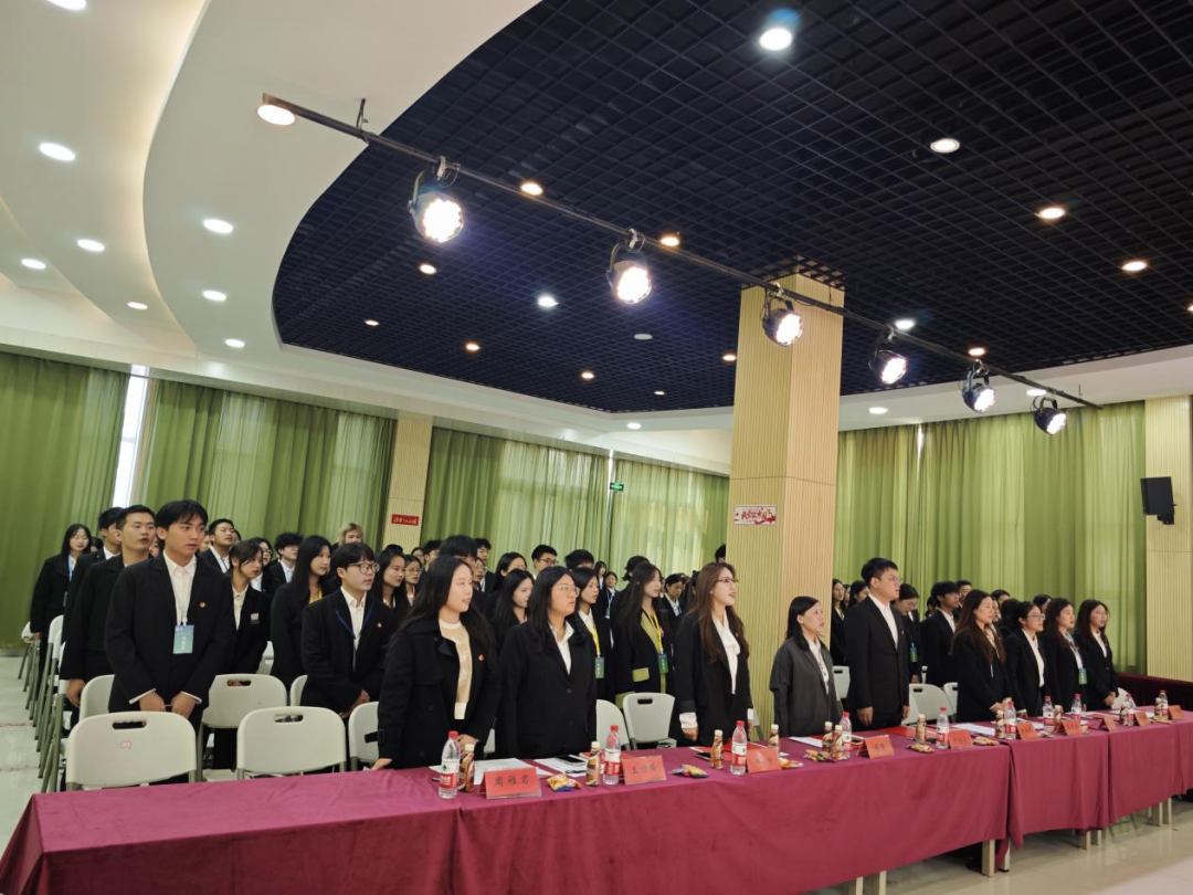 当激昂雄壮的旋律——《义勇军进行曲》响起,全场肃立,全体与会代表齐声奏唱国歌,正式拉开了304永利集团第四届学生代表大会的帷幕。