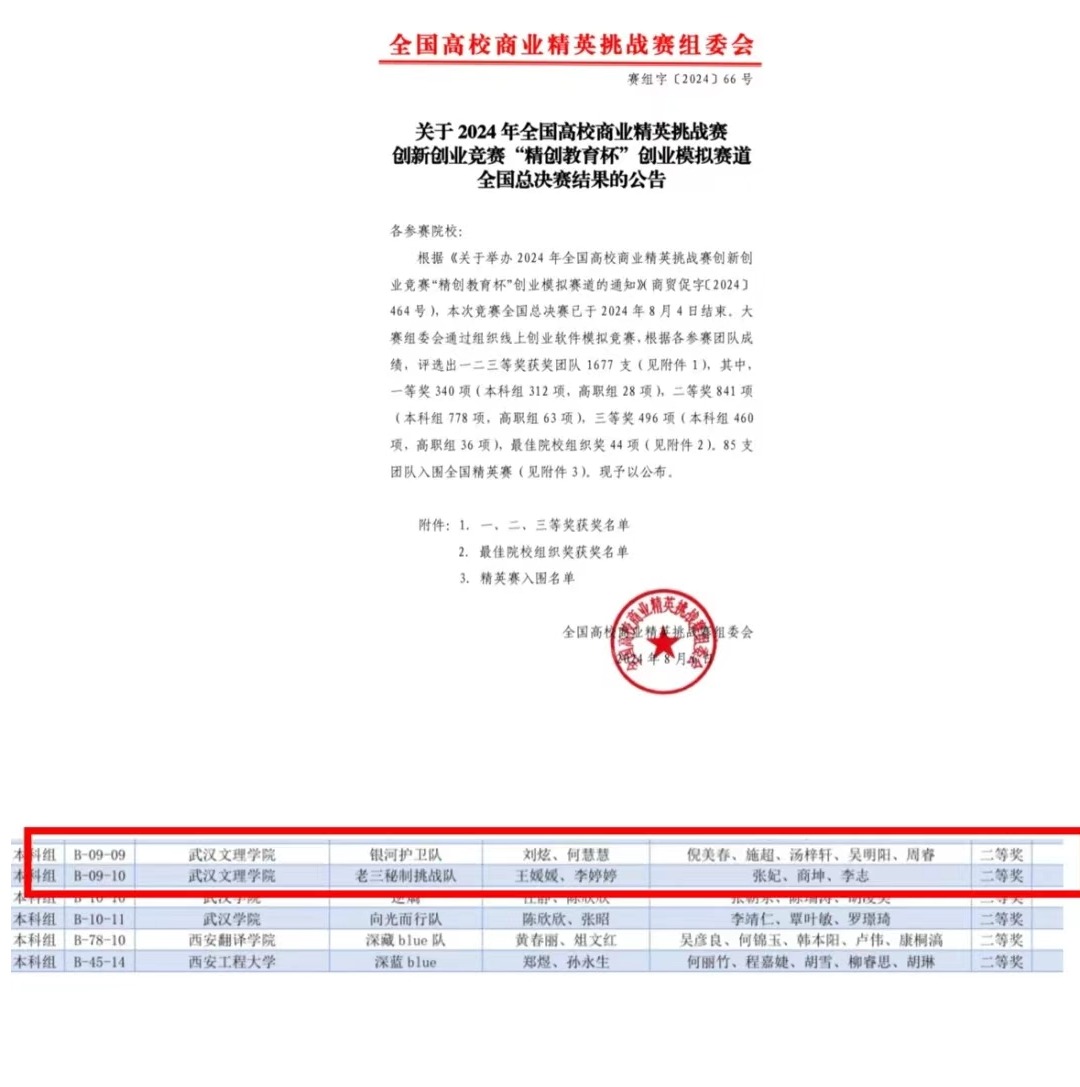 8月3日-4日,由中国贸促会商业行业委员会、中国国际商会商业行业商会、中国商业经济学会主办,浙江精创教育科技有限公司提供竞赛软件技术支持的2024年全国高校商业精英挑战赛创新创业竞赛“精创教育杯”创业模拟赛道全国总决赛于线上落下帷幕。我校4支参赛团队表现出色,喜获国家级二等奖3项,国家级三等奖1项的优异成绩。
