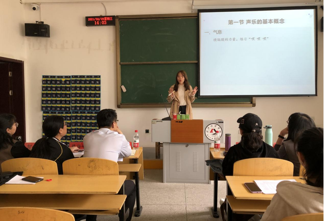 王秋雨老师通过演唱二战时期著名歌曲《喀秋莎》导入课程,润物无声进行课程思政,她讲授了声乐的基本概念,通过咳嗽等行为解释发声方法,最后以现场演唱的方式教授歌曲。王梦老师讲授的是发展心理学中的依恋,图文并茂的地展示了不同理论之下“依恋”的内涵。汪六琴老师以绚丽多彩的图案、内容丰富的PPT,介绍了幼儿游戏的相关理论。曹卓老师通过介绍不同国家的协商民主来展示我国协商民主的合理性与正当性。