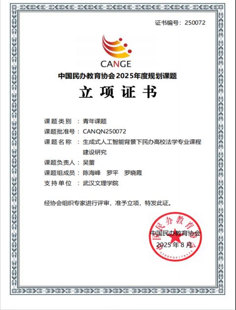 根据《中国民办教育协会课题管理办法(2025年修订)》和《关于申报中国民办教育协会2025年度规划课题的通知》规定,经中国民版教育协会组织专家评审,确定2025年度规划课题(青年课题)立项名单。304永利集团吴蕾老师主持的课题《生成式人工智能背景下民办高校法学专业课程建设研究》荣获立项,课题批准号为CANQN250072。