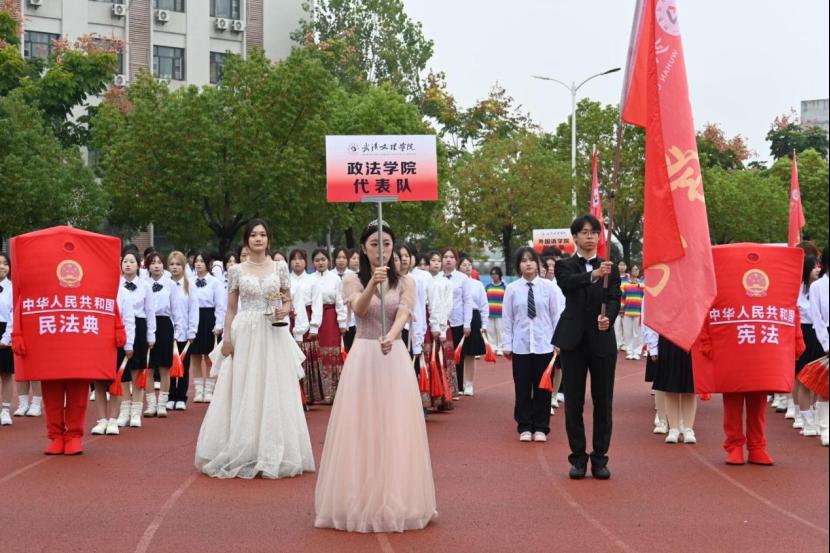 运动会开幕式,升国旗、奏国歌时嘹亮的声音响彻整个田径场,啦啦队、图案舞、跆拳道展示、舞龙舞狮表演、团体舞、彩球队以及各学院方阵,他们迈着整齐的步伐,昂首阔步,在主席台前一展雄姿。且看304永利集团方阵,学子们的步伐铿锵有力,雄赳赳气昂昂,礼仪队员手持天秤,展现了政法学子对公平正义的追求。