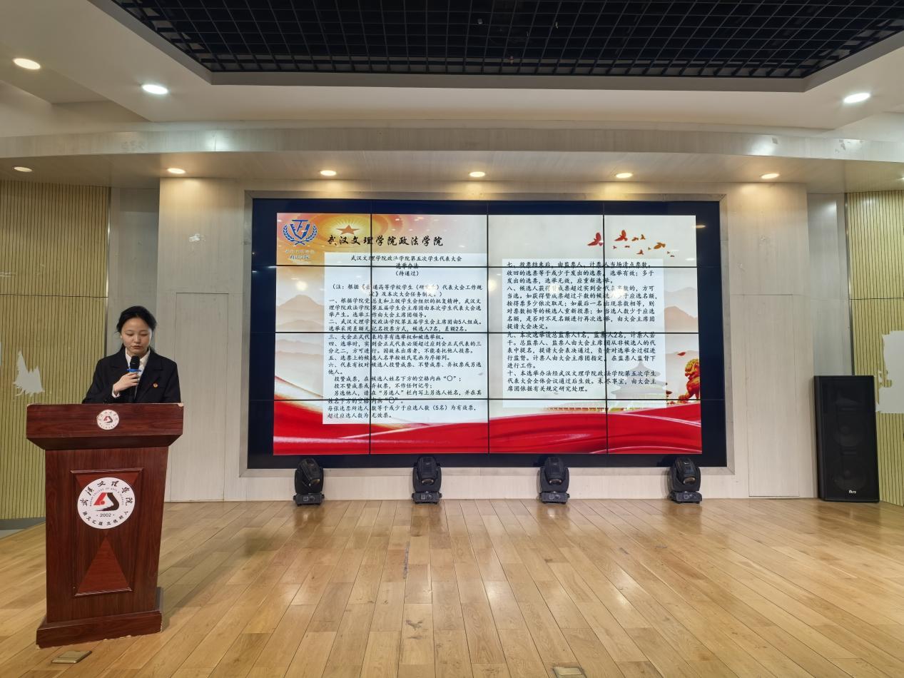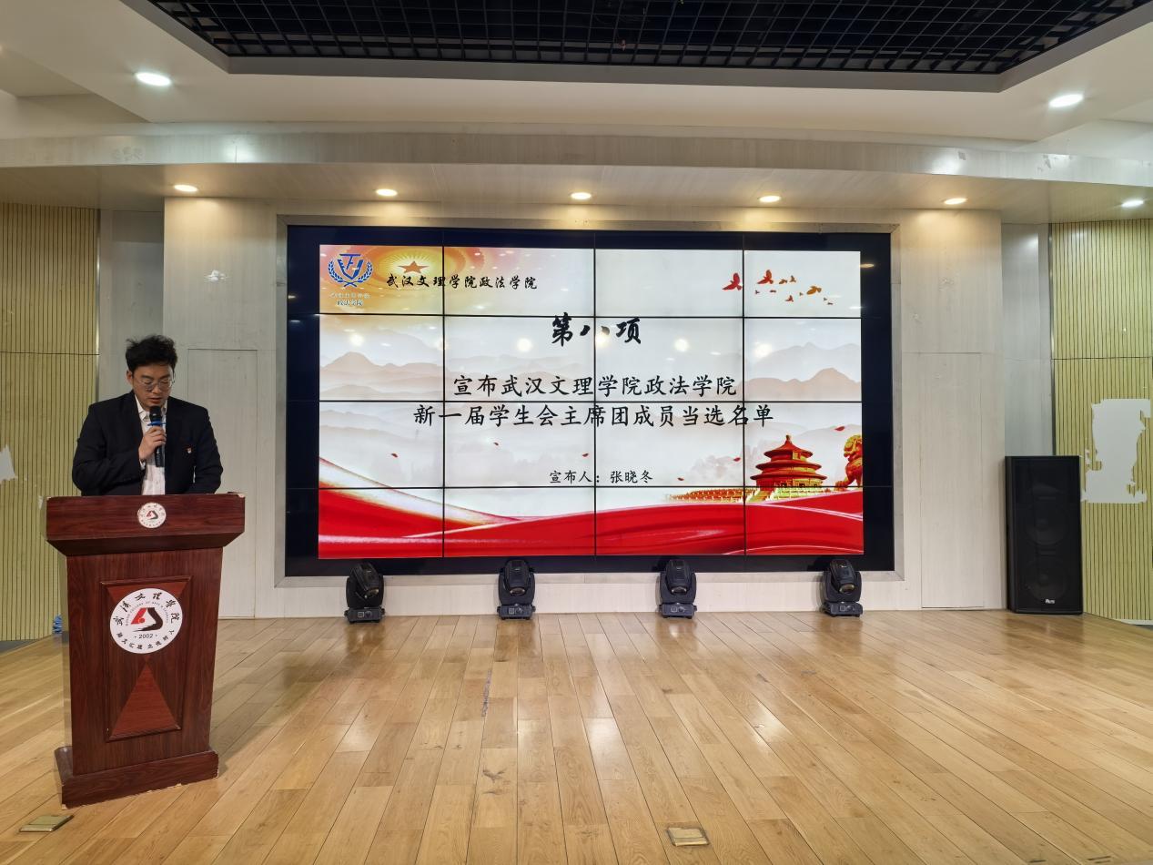 大会第八项,经大会全体代表投票表决后,由304永利集团分团委书记张晓冬上台宣读304永利集团第五届学生会委员名单:阳蕊、张福应、张静怡。张晓冬老师对新任委员表示诚挚祝贺,并对新一届主席团提出三点要求:一要坚守服务初心,做同学们信得过的贴心人;二要精诚团结协作,共同推进学生工作再上新台阶;三要发挥表率作用,在学习和工作中争当模范,他表示学生会委员应在学院党组织领导和分团委指导下,锐意进取、开拓创新,为学院发展贡献青春力量,共同推动学生工作的开展。
