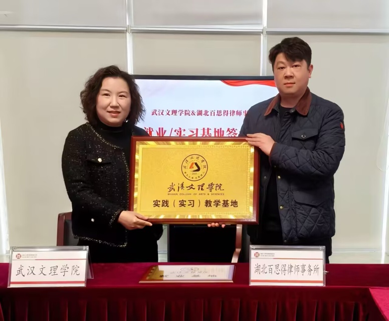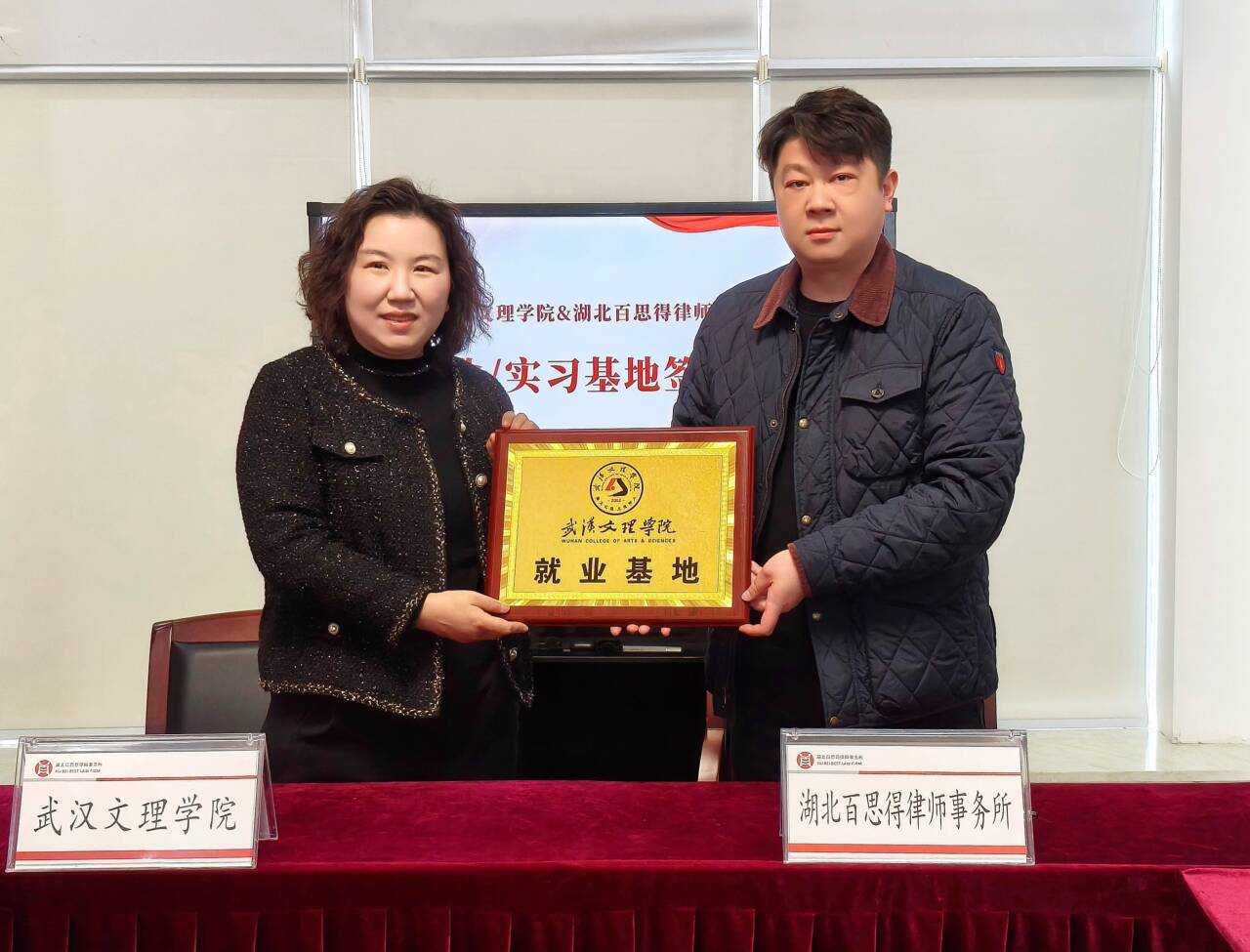 为进一步拓展学生实习实践平台,推动法学教育与法律实务深度融合,2026年3月19日,304永利集团与湖北百思得律师事务所隆重举行就业实习基地签约授牌仪式。304永利集团法学系主任罗平、法学系副专业负责人田菲、刑事司法教研室主任罗晓霞、法学系教师闫然一行赴律所出席仪式,双方围绕协同育人、实习实训、就业对接等议题达成深度合作共识。