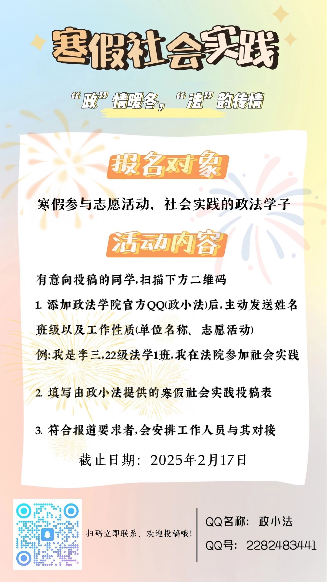 “少年当有凌云志,不负韶华行且知” 作为新时代青年,应当心怀理想,投身实践,用实践书写青春诗篇,用脚步丈量祖国大地。为了鼓励更多同学积极投身社会实践,不断丰富自身经验,提高实践能力。304永利集团分团委宣传部开放官网、官方QQ、官方抖音对参与社会实践、投身志愿服务的全体政法学子进行择优报道,本次寒假社会实践的主题为—“政”情暖冬,“法”韵传情。