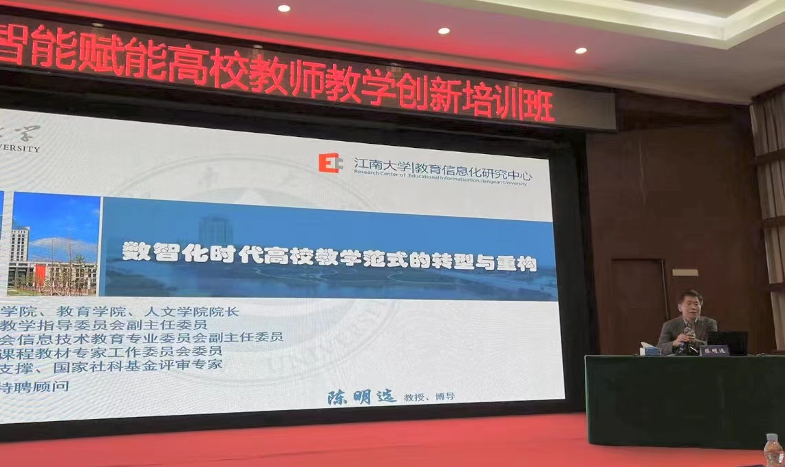 随着正式开班,江南大学陈明选教授首先以《数智化时代高校教学创新的理念与方法》为题进行了专题授课。陈明选教授介绍了智能技术赋予教育教学的新特征,详细分析了智能技术实现精准教学、因材施教的全过程,并展示了基于AI学习机的个性化学习实践的教师案例。
