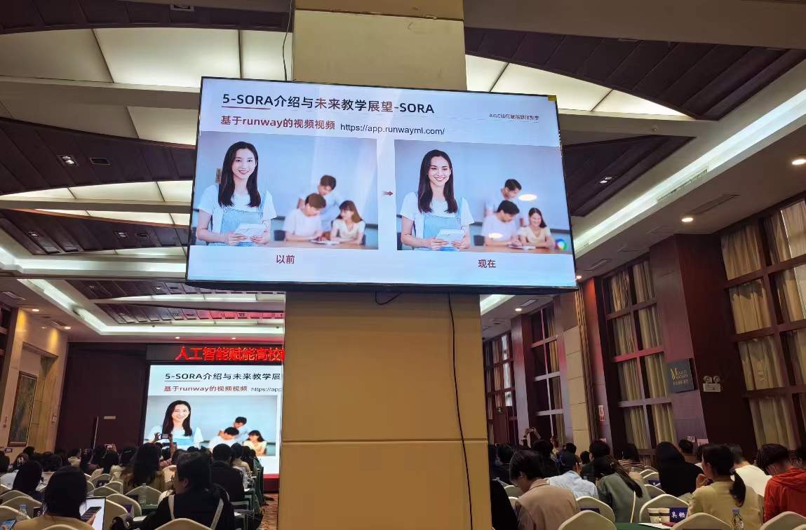 随后,上海交通大学郭政老师以《教师如何运用AI提升教学效率》为题进行了专题授课。郭政老师现场示范了ChatGPT及各类AI工具的操作方法,展示了利用 ChatGPT 开展教学优秀案例,并介绍了世界模拟器——Sora模型与未来基于人工智能的教学场景展望。